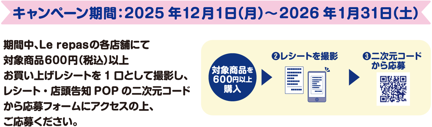 期間終了後、厳正なる抽選の上、当選通知(こ登録いただいたメールアドレス宛)をもって発表にかえさせていただきます。